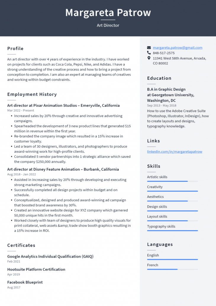 Art director resume template. Crafting an impressive resume can be a overwhelming job, especially if you’re going back to square one. Thankfully, there are a wide variety of complimentary resume themes offered online to simplify the process. These design templates offer a variety of styles and designs, enabling you to showcase your skills and experience in a visually appealing and professional manner.