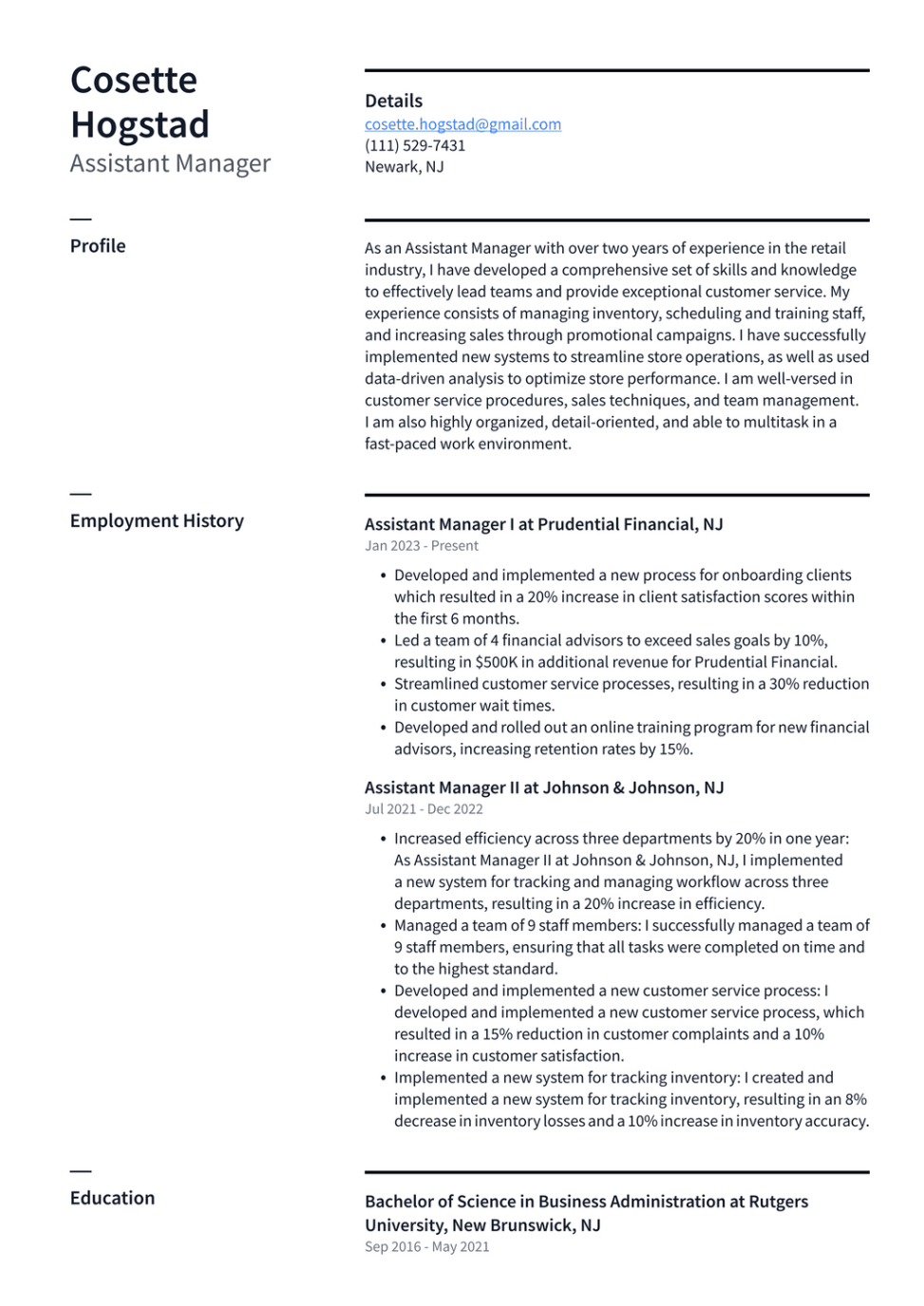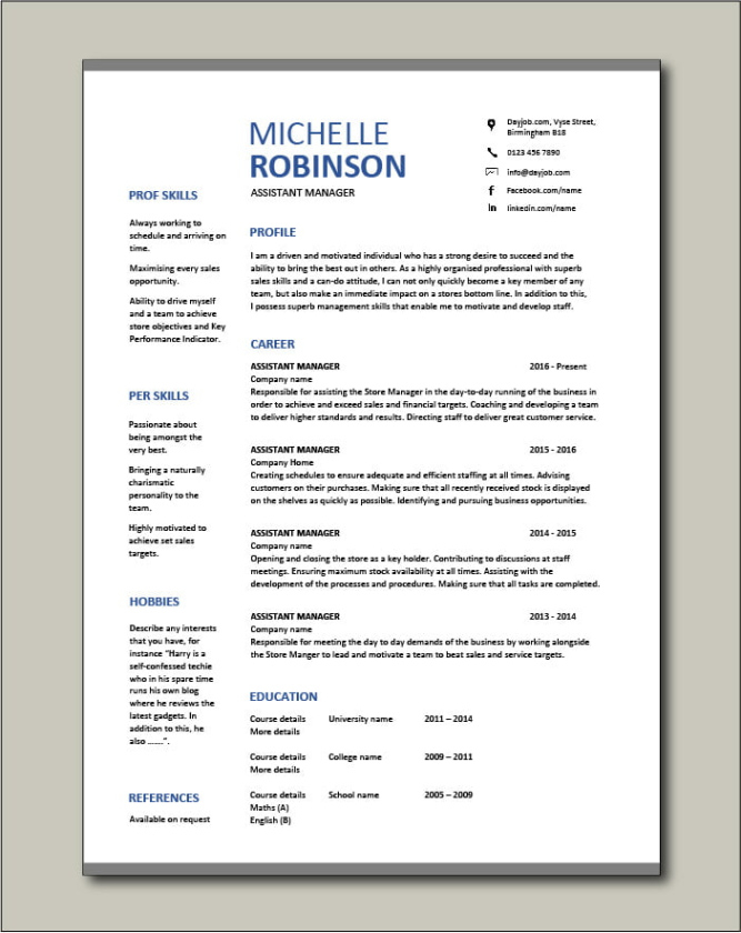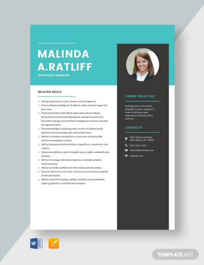 Assistant manager resume template. When it pertains to job hunting, a well-crafted return to is necessary for making a strong first impression on possible companies. A resume is a succinct recap of your skills, experience, and certifications, designed to display your suitability for the role you’re making an application for. While developing a return to can be a challenging task, utilizing a resume template can significantly simplify the process and help you stand out from the competition.