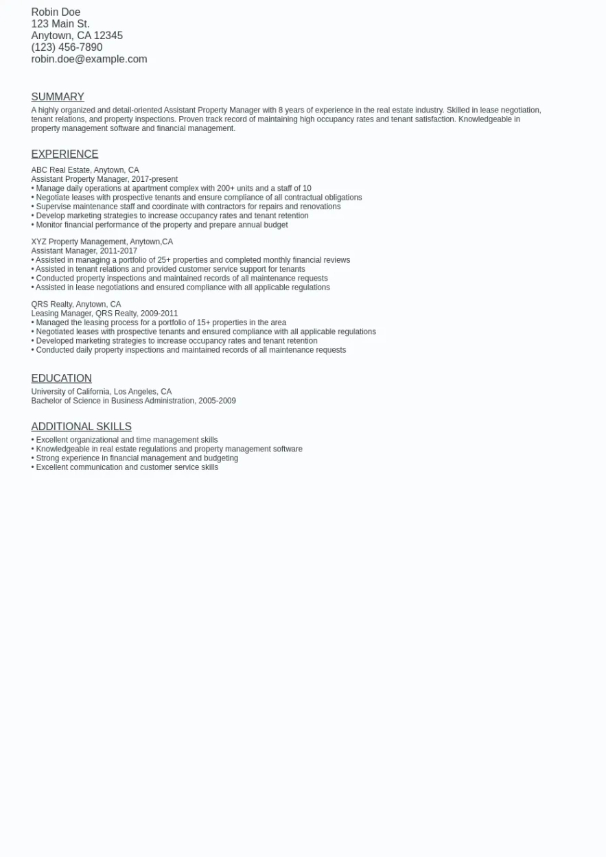 Assistant property manager resume template. When it concerns task hunting, a well-crafted return to is crucial for making a strong first impression on potential employers. A resume is a concise summary of your skills, experience, and qualifications, designed to showcase your viability for the role you’re looking for. While creating a return to can be a challenging task, making use of a resume template can considerably simplify the procedure and aid you stand apart from the competition.