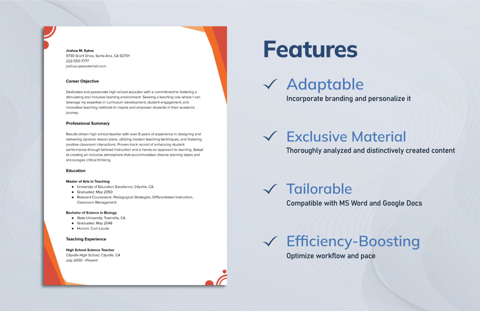 High school teacher resume template. In the affordable globe of job hunting, your resume is typically the first impression you make on a prospective employer. Having a efficient, professional resume is critical to sticking out from the group. One efficient way to guarantee your return to stands out of recruiters is by using a resume template. These pre-designed styles supply framework, design, and capability, making it simpler for job seekers to develop a sleek document that highlights their abilities and experience.