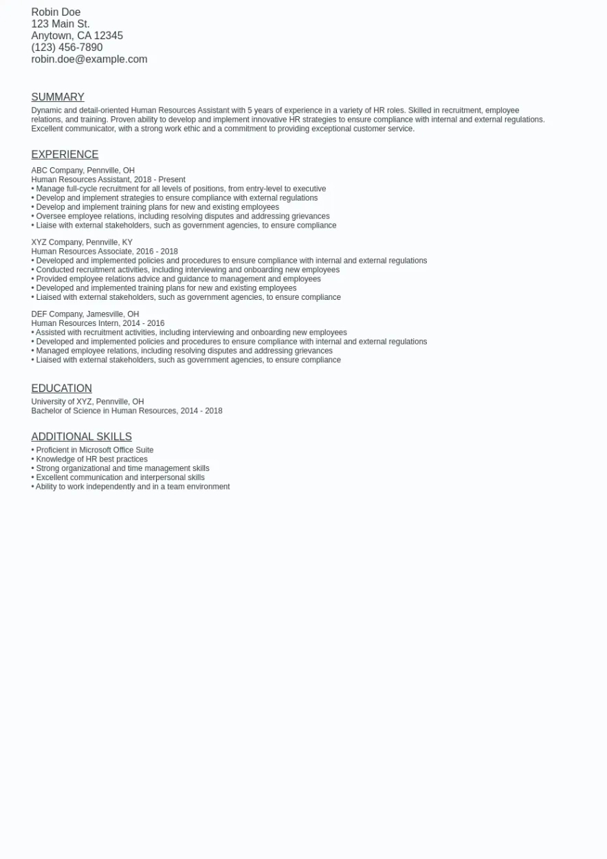 Human resources assistant resume template. When it concerns work hunting, a well-crafted resume is essential for making a strong first impression on possible employers. A resume is a succinct recap of your abilities, experience, and qualifications, made to showcase your viability for the function you’re getting. While developing a return to can be a daunting task, using a resume template can considerably streamline the process and aid you attract attention from the competitors.