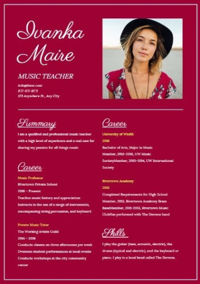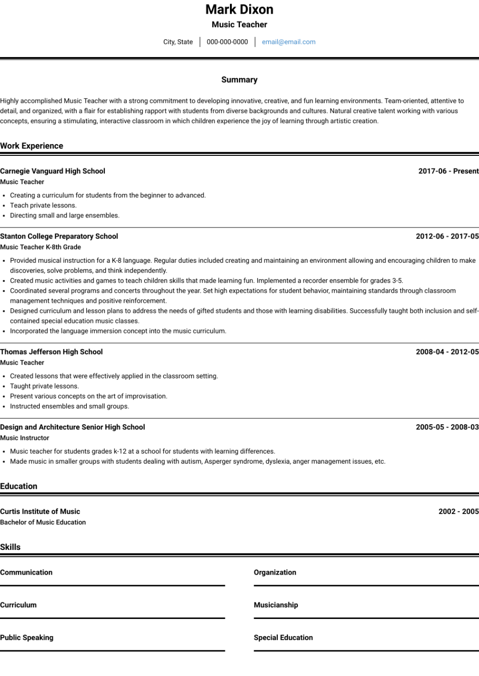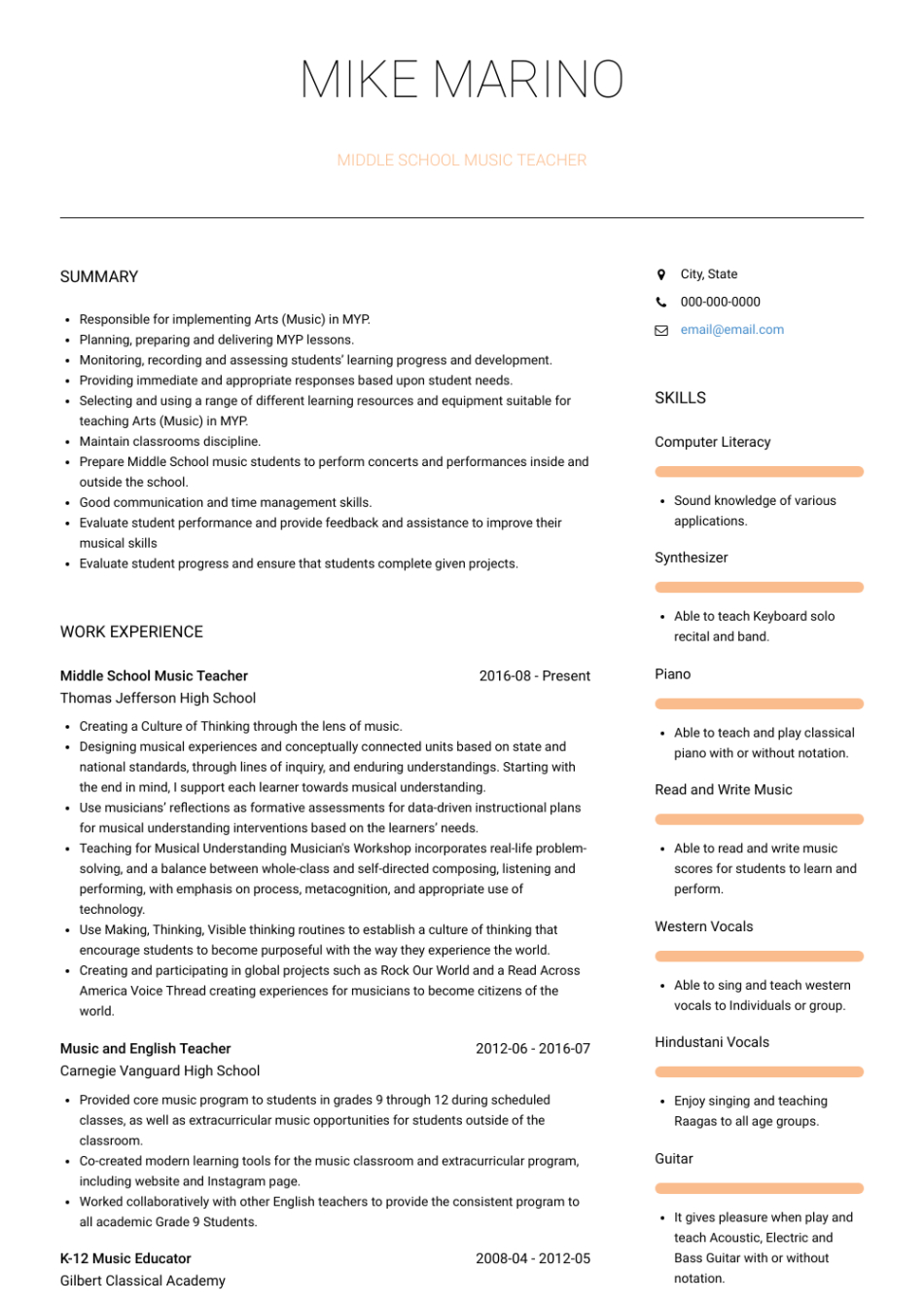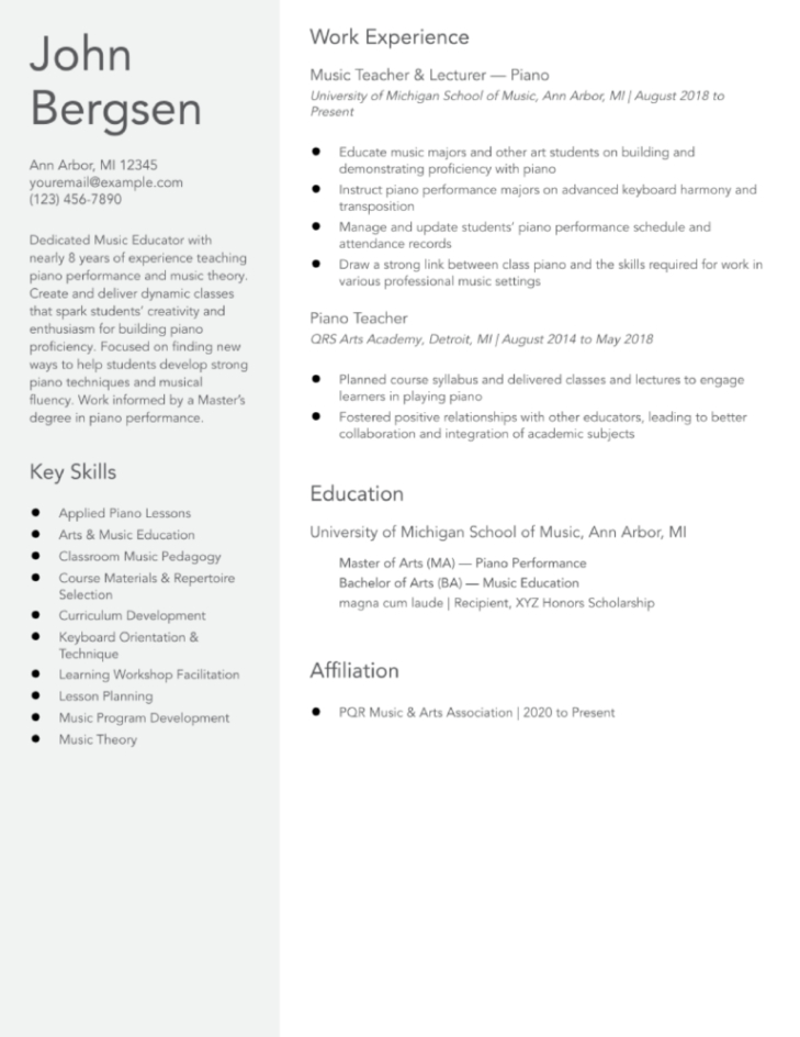 Music teacher resume template. Crafting an outstanding return to can be a difficult job, specifically if you’re starting from scratch. The good news is, there are a variety of totally free return to layouts available online to streamline the procedure. These themes provide a selection of styles and designs, allowing you to showcase your skills and experience in a visually enticing and expert manner.