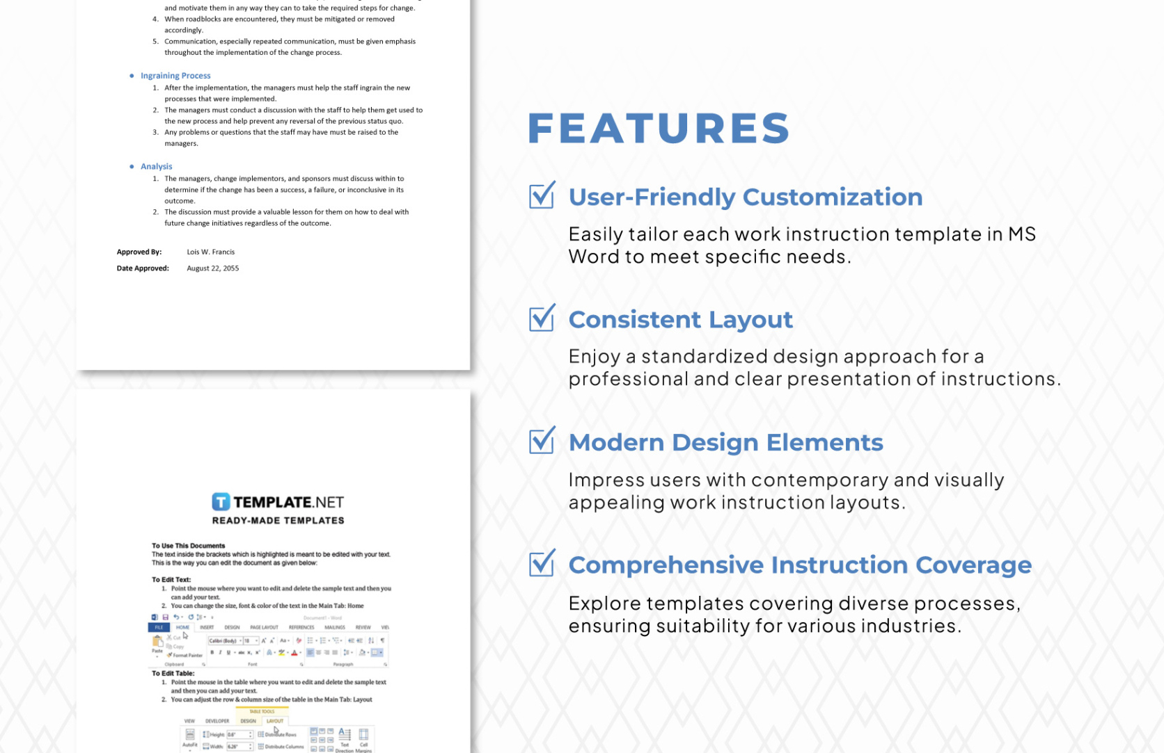 Another plus is enhanced efficiency. Instead of starting from scratch each time, you can simply modify an existing template to meet your requirements. This saves you valuable time and energy, allowing you to focus on the content of your instructions rather than the formatting. Think of having a pre-designed template for all your work protocols or recipe sharing. It makes the process much easier.