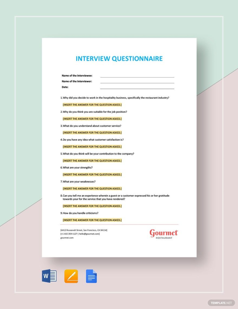 Restaurant interview questions template. Meeting layouts are indispensable tools in the modern hiring landscape, providing a organized approach to analyzing candidates successfully and fairly. These design templates provide a regular framework that aids interviewers browse the complicated process of assessing potential hires. By standardizing inquiries and assessment requirements, interview layouts ensure that every prospect is analyzed on a level playing field, decreasing the likelihood of bias and making it simpler to compare candidates objectively.